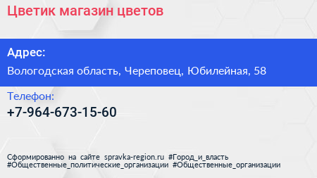 Цветик, магазин цветов по адресу Вологодская область, Череповец, Юбилейная, 58 в дальнейшем Организация, размещена в следующих категориях: