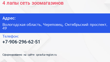 4 лапы, сеть зоомагазинов по адресу Вологодская область, Череповец, Октябрьский проспект, 49 в дальнейшем Организация, размещена в следующих категориях: