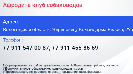 Афродита, клуб собаководов по адресу Вологодская область, Череповец, Командарма Белова, 29а в дальнейшем Организация, размещена в следующих категориях: