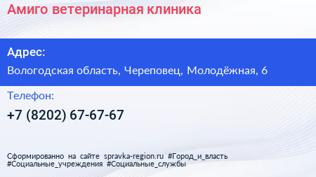 Амиго, ветеринарная клиника по адресу Вологодская область, Череповец, Молодёжная, 6 в дальнейшем Организация, размещена в следующих категориях: