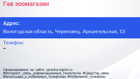 Гав, зоомагазин по адресу Вологодская область, Череповец, Архангельская, 13 в дальнейшем Организация, размещена в следующих категориях: