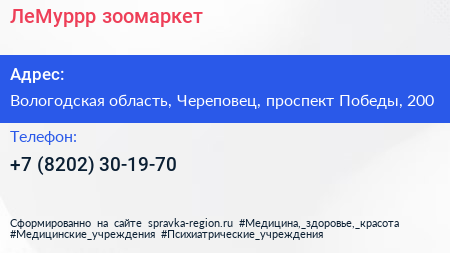 ЛеМуррр, зоомаркет по адресу Вологодская область, Череповец, проспект Победы, 200 в дальнейшем Организация, размещена в следующих категориях: