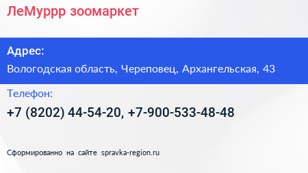 ЛеМуррр, зоомаркет по адресу Вологодская область, Череповец, Архангельская, 43 в дальнейшем Организация, размещена в следующих категориях: