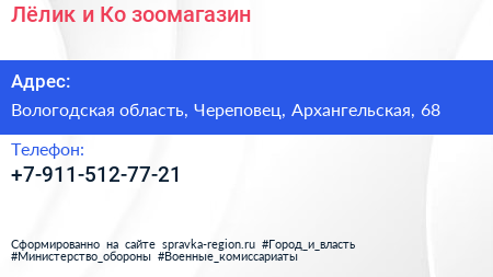 Лёлик и Ко, зоомагазин по адресу Вологодская область, Череповец, Архангельская, 68 в дальнейшем Организация, размещена в следующих категориях: