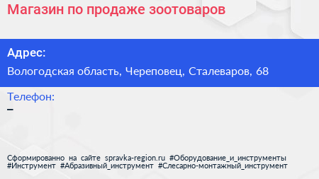 Магазин по продаже зоотоваров по адресу Вологодская область, Череповец, Сталеваров, 68 в дальнейшем Организация, размещена в следующих категориях: