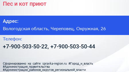 Пес и кот, приют по адресу Вологодская область, Череповец, Окружная, 26 в дальнейшем Организация, размещена в следующих категориях: