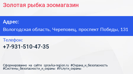 Золотая рыбка, зоомагазин по адресу Вологодская область, Череповец, проспект Победы, 131 в дальнейшем Организация, размещена в следующих категориях: