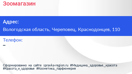 Зоомагазин по адресу Вологодская область, Череповец, Краснодонцев, 110 в дальнейшем Организация, размещена в следующих категориях: