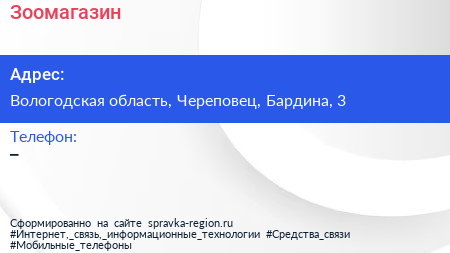 Зоомагазин по адресу Вологодская область, Череповец, Бардина, 3 в дальнейшем Организация, размещена в следующих категориях: