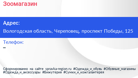 Зоомагазин по адресу Вологодская область, Череповец, проспект Победы, 125 в дальнейшем Организация, размещена в следующих категориях: