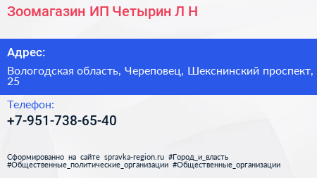 Зоомагазин, ИП Четырин Л.Н. по адресу Вологодская область, Череповец, Шекснинский проспект, 25 в дальнейшем Организация, размещена в следующих категориях: