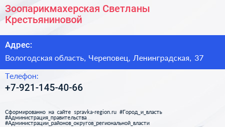 Зоопарикмахерская Светланы Крестьяниновой по адресу Вологодская область, Череповец, Ленинградская, 37 в дальнейшем Организация, размещена в следующих категориях: