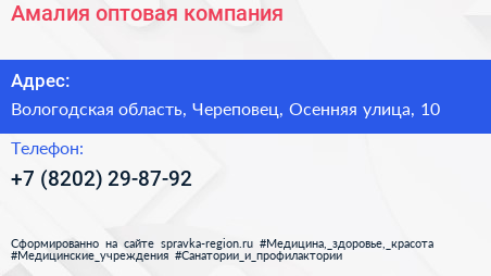 Амалия, оптовая компания по адресу Вологодская область, Череповец, Осенняя улица, 10 в дальнейшем Организация, размещена в следующих категориях: