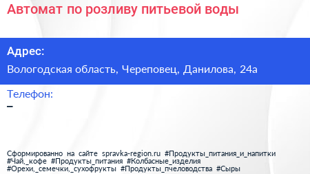 Автомат по розливу питьевой воды по адресу Вологодская область, Череповец, Данилова, 24а в дальнейшем Организация, размещена в следующих категориях: