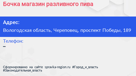 Бочка, магазин разливного пива по адресу Вологодская область, Череповец, проспект Победы, 189 в дальнейшем Организация, размещена в следующих категориях: