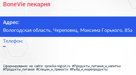 BoneVie, пекарня по адресу Вологодская область, Череповец, Максима Горького, 85а в дальнейшем Организация, размещена в следующих категориях: