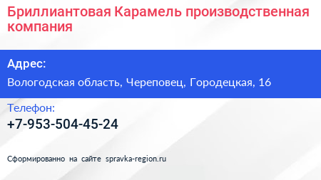 Бриллиантовая Карамель, производственная компания по адресу Вологодская область, Череповец, Городецкая, 16 в дальнейшем Организация, размещена в следующих категориях: