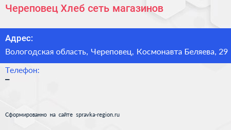 Череповец Хлеб, сеть магазинов по адресу Вологодская область, Череповец, Космонавта Беляева, 29 в дальнейшем Организация, размещена в следующих категориях: