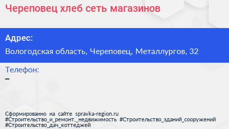 Череповец хлеб, сеть магазинов по адресу Вологодская область, Череповец, Металлургов, 32 в дальнейшем Организация, размещена в следующих категориях: