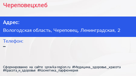 Череповецхлеб по адресу Вологодская область, Череповец, Ленинградская, 2 в дальнейшем Организация, размещена в следующих категориях: