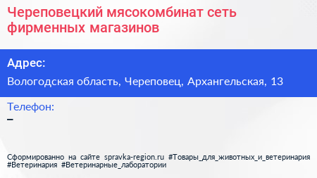 Череповецкий мясокомбинат, сеть фирменных магазинов по адресу Вологодская область, Череповец, Архангельская, 13 в дальнейшем Организация, размещена в следующих категориях: