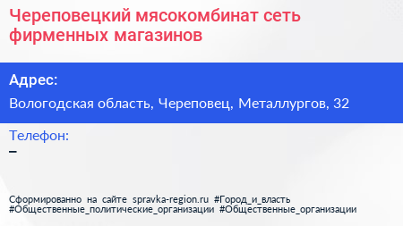 Череповецкий мясокомбинат, сеть фирменных магазинов по адресу Вологодская область, Череповец, Металлургов, 32 в дальнейшем Организация, размещена в следующих категориях:
