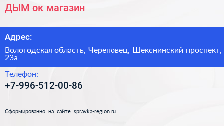 ДЫМ`ок, магазин по адресу Вологодская область, Череповец, Шекснинский проспект, 23а в дальнейшем Организация, размещена в следующих категориях: