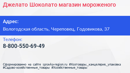 Джелато Шоколато, магазин мороженого по адресу Вологодская область, Череповец, Годовикова, 37 в дальнейшем Организация, размещена в следующих категориях: