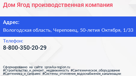 Дом Ягод, производственная компания по адресу Вологодская область, Череповец, 50-летия Октября, 1/33 в дальнейшем Организация, размещена в следующих категориях:
