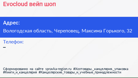 Evocloud, вейп-шоп по адресу Вологодская область, Череповец, Максима Горького, 32 в дальнейшем Организация, размещена в следующих категориях: