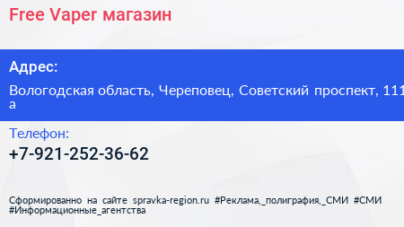 Free Vaper, магазин по адресу Вологодская область, Череповец, Советский проспект, 111 а в дальнейшем Организация, размещена в следующих категориях: