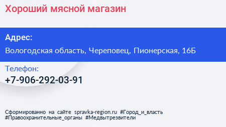 Хороший, мясной магазин по адресу Вологодская область, Череповец, Пионерская, 16Б в дальнейшем Организация, размещена в следующих категориях: