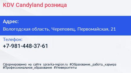 KDV Candyland, розница по адресу Вологодская область, Череповец, Первомайская, 21 в дальнейшем Организация, размещена в следующих категориях: