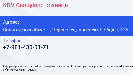 KDV Candyland, розница по адресу Вологодская область, Череповец, проспект Победы, 135 в дальнейшем Организация, размещена в следующих категориях: