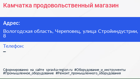Камчатка, продовольственный магазин по адресу Вологодская область, Череповец, улица Стройиндустрии, 8 в дальнейшем Организация, размещена в следующих категориях: