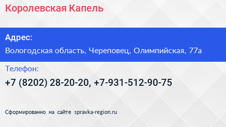 Королевская Капель по адресу Вологодская область, Череповец, Олимпийская, 77а в дальнейшем Организация, размещена в следующих категориях: