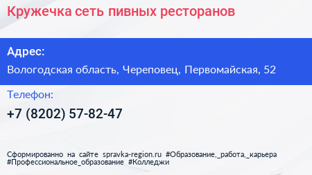 Кружечка, сеть пивных ресторанов по адресу Вологодская область, Череповец, Первомайская, 52 в дальнейшем Организация, размещена в следующих категориях: