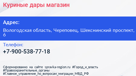 Куриные дары, магазин по адресу Вологодская область, Череповец, Шекснинский проспект, 6 в дальнейшем Организация, размещена в следующих категориях: