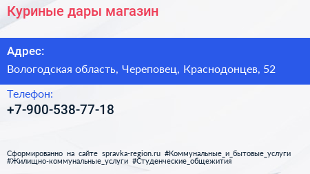 Куриные дары, магазин по адресу Вологодская область, Череповец, Краснодонцев, 52 в дальнейшем Организация, размещена в следующих категориях: