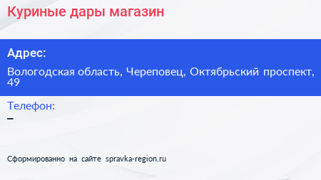 Куриные дары, магазин по адресу Вологодская область, Череповец, Октябрьский проспект, 49 в дальнейшем Организация, размещена в следующих категориях: