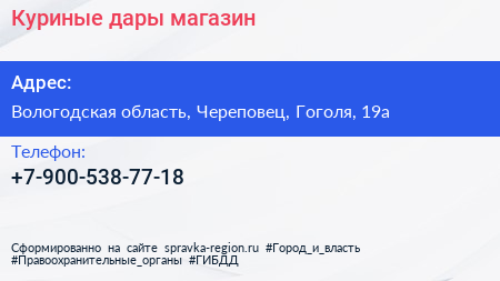 Куриные дары, магазин по адресу Вологодская область, Череповец, Гоголя, 19а в дальнейшем Организация, размещена в следующих категориях:
