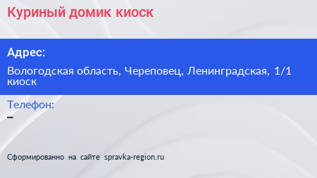 Куриный домик, киоск по адресу Вологодская область, Череповец, Ленинградская, 1/1 киоск в дальнейшем Организация, размещена в следующих категориях: