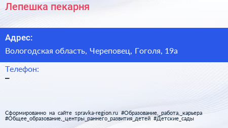 Лепешка, пекарня по адресу Вологодская область, Череповец, Гоголя, 19а в дальнейшем Организация, размещена в следующих категориях: