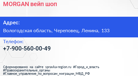 MORGAN, вейп-шоп по адресу Вологодская область, Череповец, Ленина, 133 в дальнейшем Организация, размещена в следующих категориях: