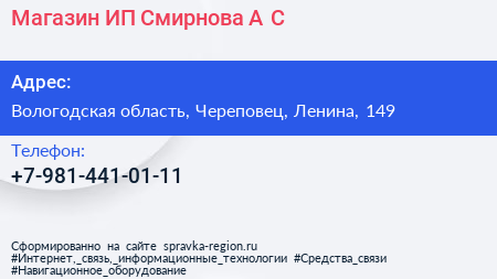 Магазин, ИП Смирнова А.С. по адресу Вологодская область, Череповец, Ленина, 149 в дальнейшем Организация, размещена в следующих категориях: