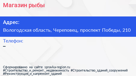 Магазин рыбы по адресу Вологодская область, Череповец, проспект Победы, 210 в дальнейшем Организация, размещена в следующих категориях: