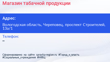 Магазин табачной продукции по адресу Вологодская область, Череповец, проспект Строителей, 13а/1 в дальнейшем Организация, размещена в следующих категориях: