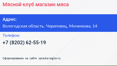 Мясной клуб, магазин мяса по адресу Вологодская область, Череповец, Моченкова, 14 в дальнейшем Организация, размещена в следующих категориях: