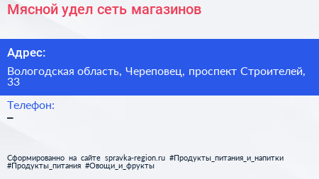 Мясной удел, сеть магазинов по адресу Вологодская область, Череповец, проспект Строителей, 33 в дальнейшем Организация, размещена в следующих категориях: