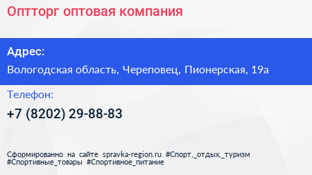 Оптторг, оптовая компания по адресу Вологодская область, Череповец, Пионерская, 19а в дальнейшем Организация, размещена в следующих категориях: